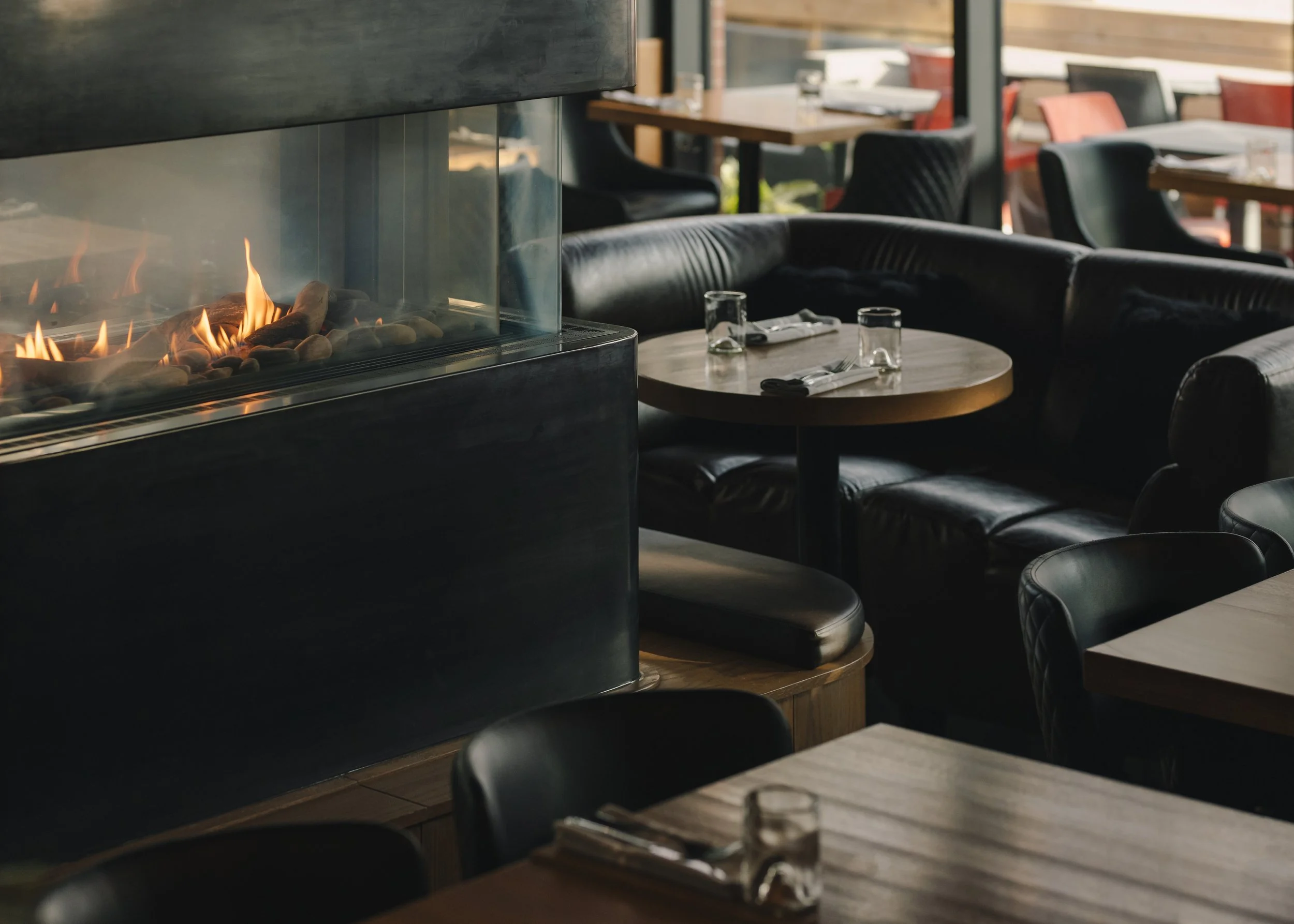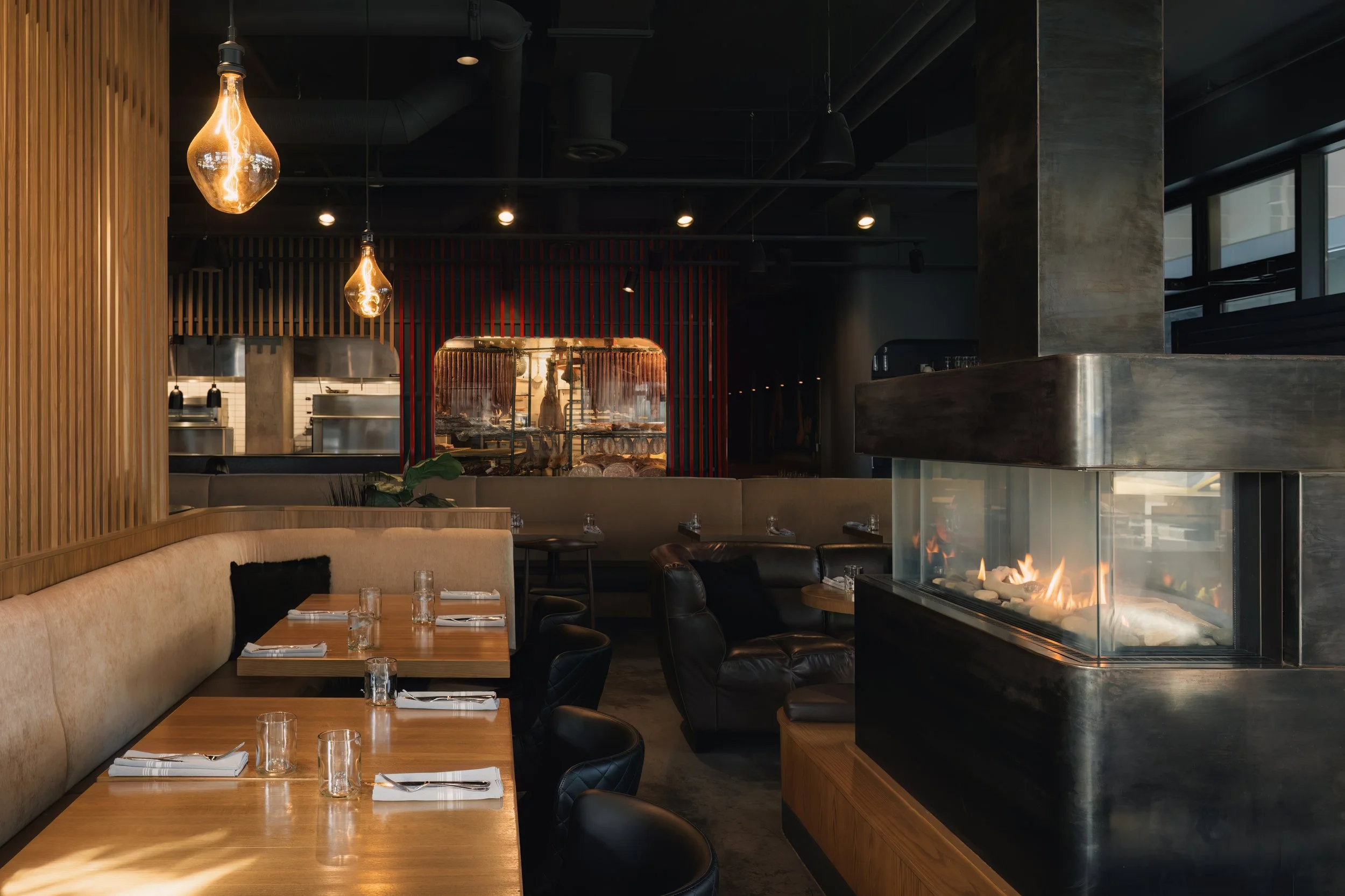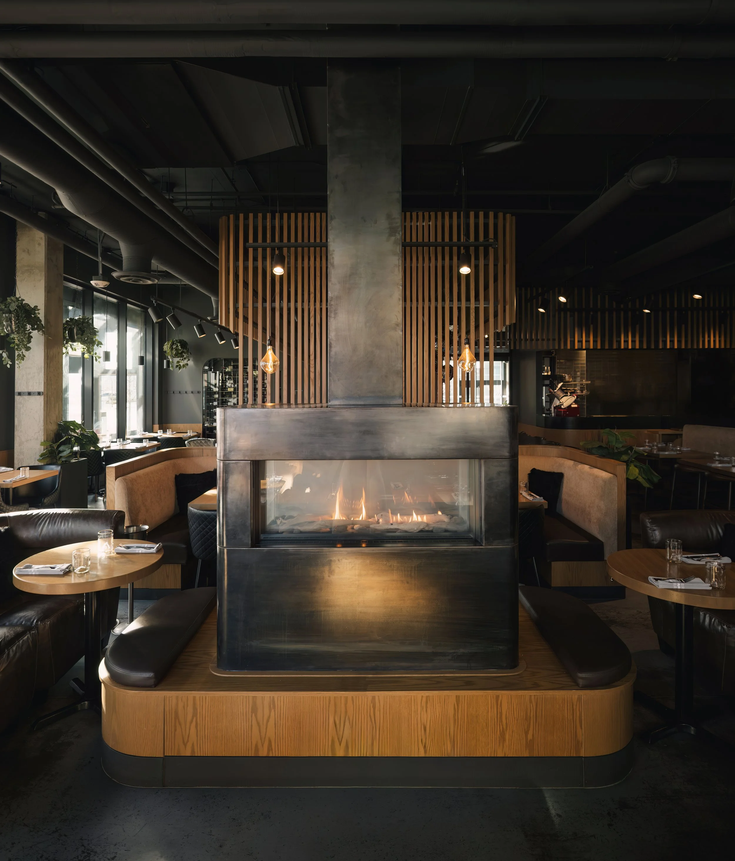 Within this field, a bar anchored by a custom fireplace formed from raw blackened steel acts as the social centre of the room. From this gathering point, the working life of the kitchen unfolds in full view. An open kitchen anchors one edge of the dining room, where a take-out pizza window engages the adjacent hotel lobby and a large meat cutter prepares cuts in plain sight.