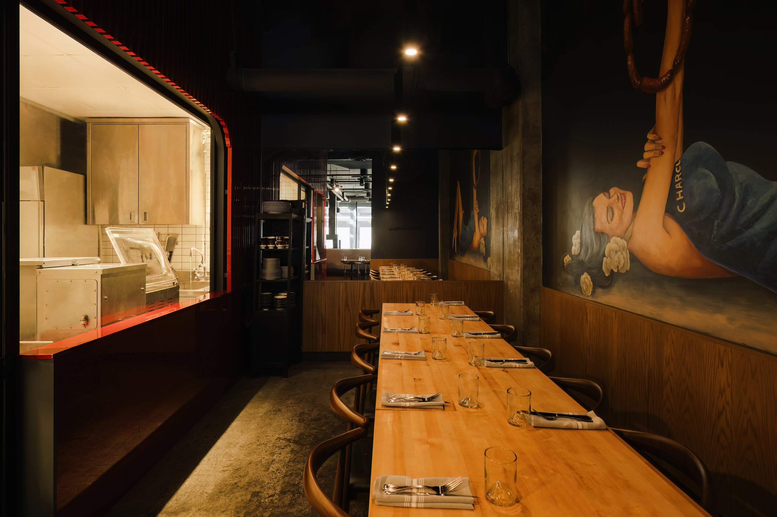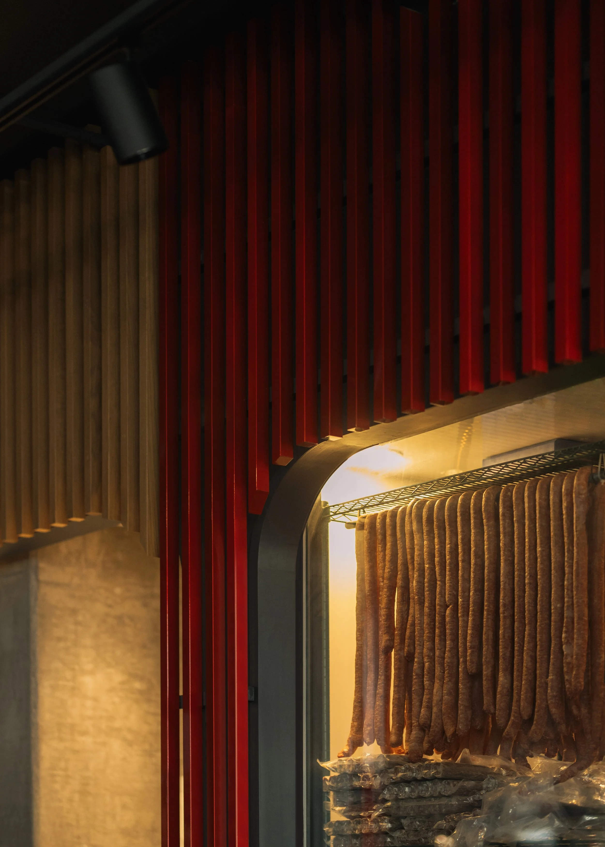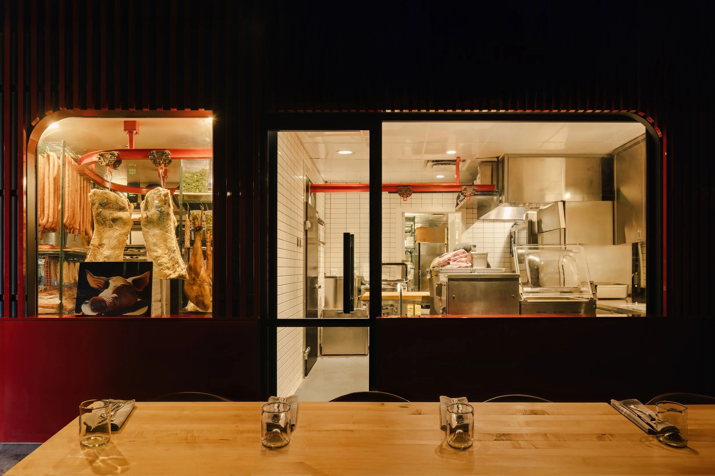 Adjacent to the open kitchen, a glazed meat locker lined with hanging salumi and a connected meat production space reveal the craft behind the kitchen’s whole-animal approach. At this moment, the oak slats shift dramatically to a glossy fire-engine red, an electric visual marker within the room that draws attention to the meat-making process while paying homage to the red stripe found on the napkins at Charcut’s original location. Beyond this point lies the Butchrina, a private dining room offering guests direct views into the making of the restaurant’s in-house meats.